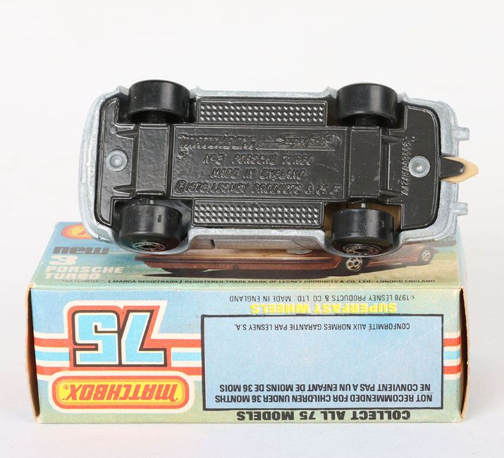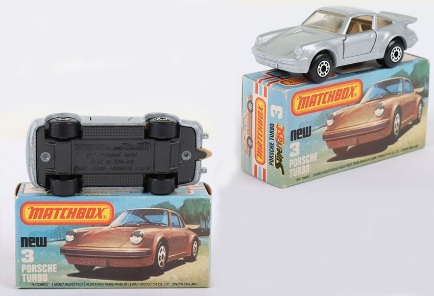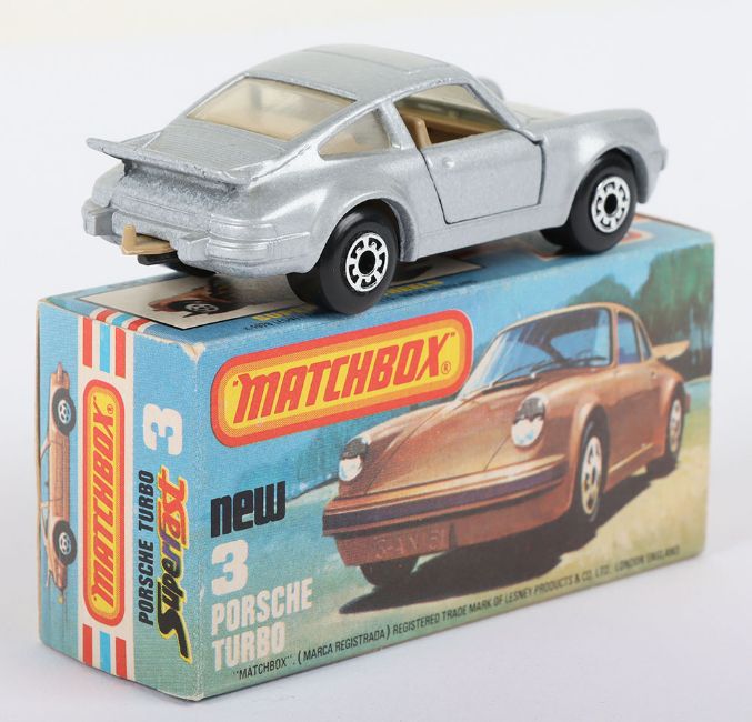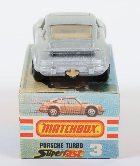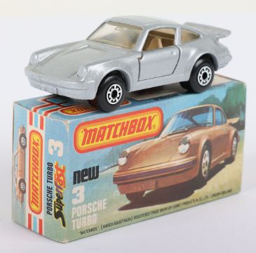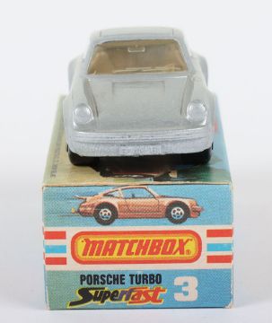 Matchbox Lesney Superfast Boxed Model, England: MB-3 Porsche Turbo, scarce TAN INTERIOR with Silver body, plus METALLIC GREY base, TAN Tow Hook, Opening doors, model very near mint to mint with a pin head ding to rear spoiler edge in a mint L box with NEW to faces and with 2 lines of text to one striker side (1 item)