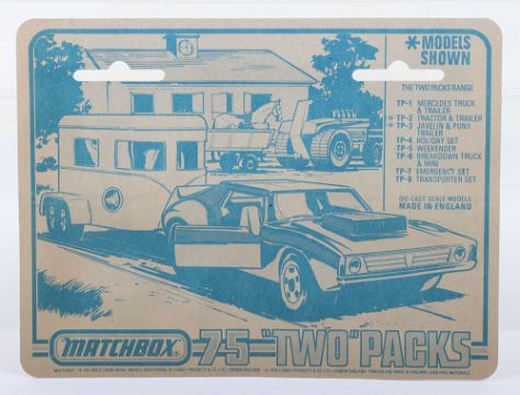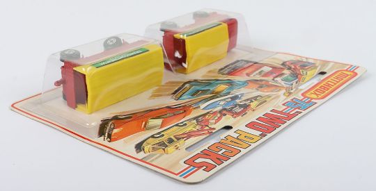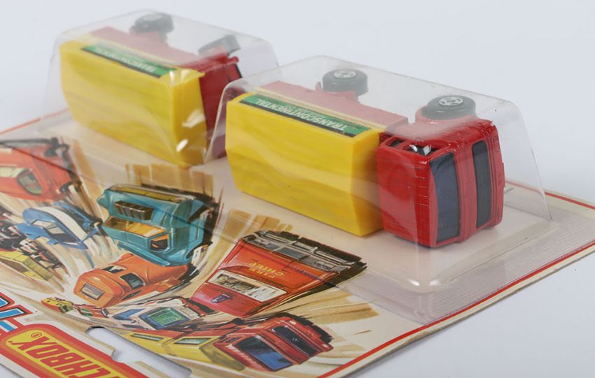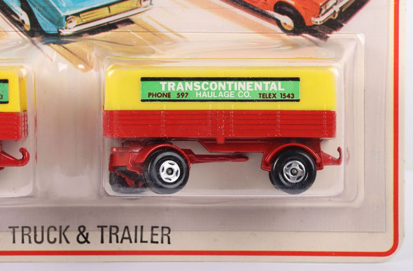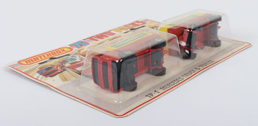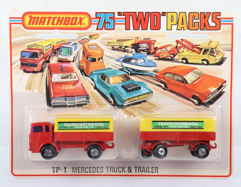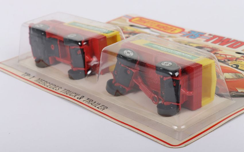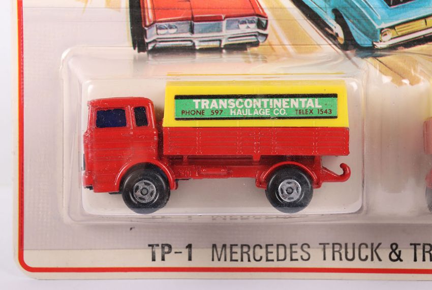 Two Matchbox Lesney Superfast Set Models, England: MB-1 Mercedes Truck and MB-2 Mercedes Trailer in TP1 Mercedes Truck & Trailer Set 1) MB-1 Mercedes Truck with RED body & Blue glass, YELLOW canopy with TRANSCONTINENTAL labels, wide 4-spoke wheels and 2) MB-2 Mercedes Trailer with RED body, YELLOW canopy with TRANSCONTINENTAL labels, wide 4-spoke wheels, both models mint in a very near mint to mint sealed from new 1975 pack (2 items)