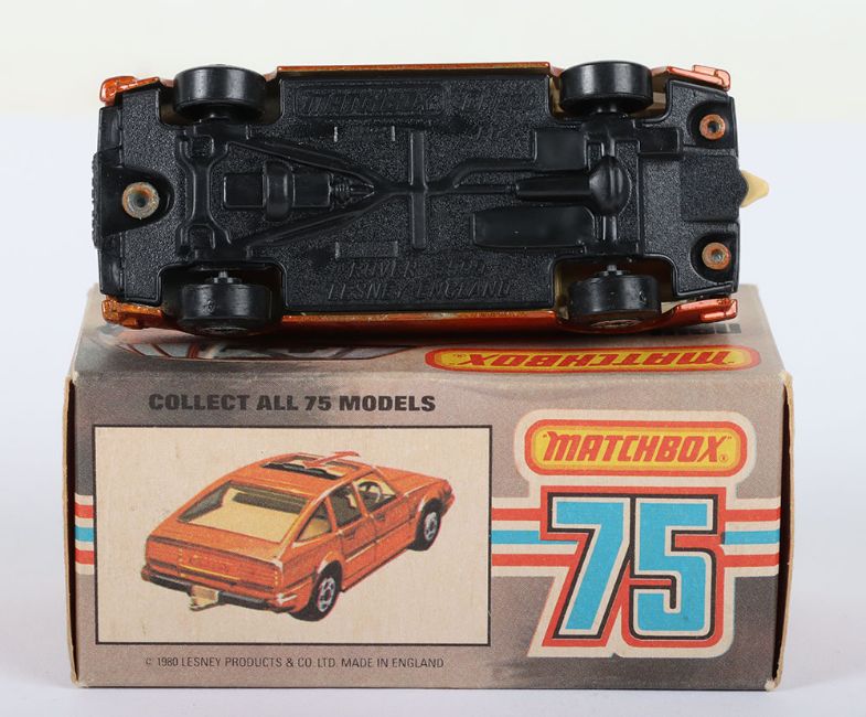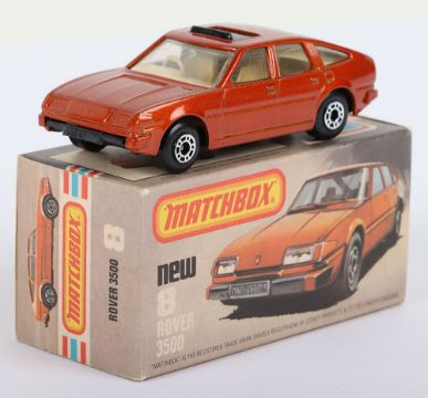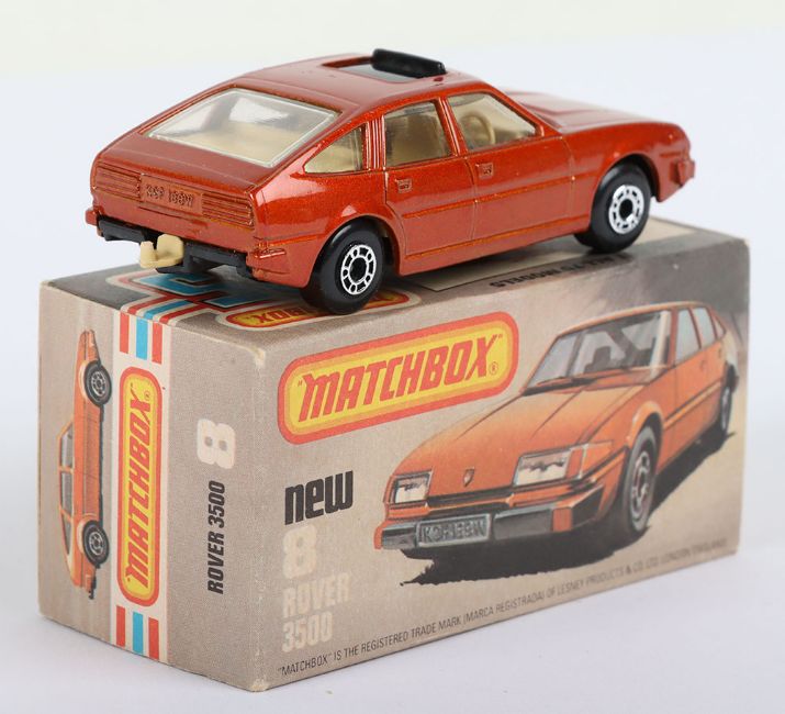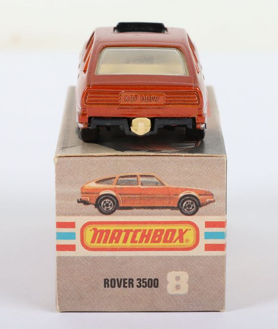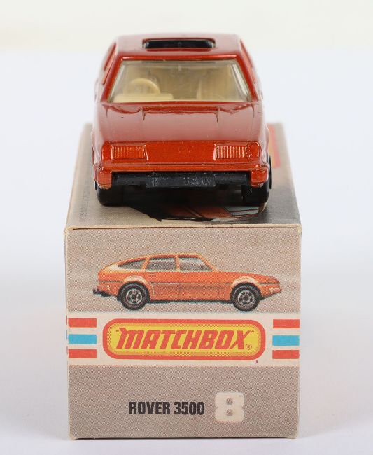 Matchbox Lesney Superfast Boxed Model, England: MB-8 Rover 3500 with Bronze body and sliding Black sunroof, Tan interior & Tow Hook, Black base, Wide Dot-Dash wheels, model is mint in a near mint L box (1 item)
