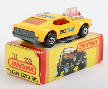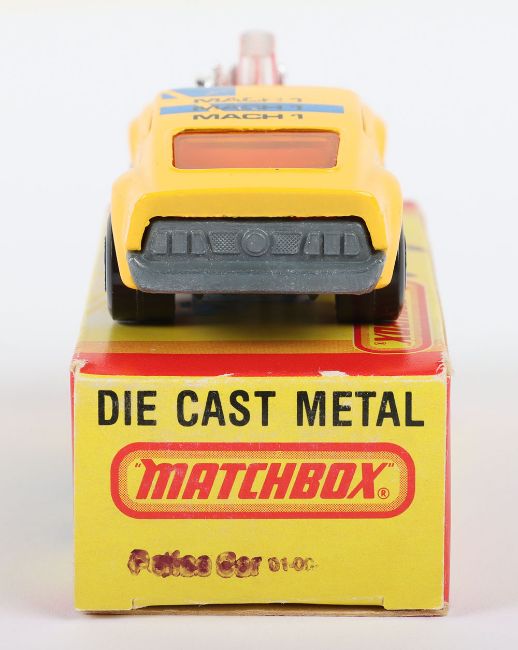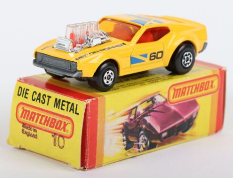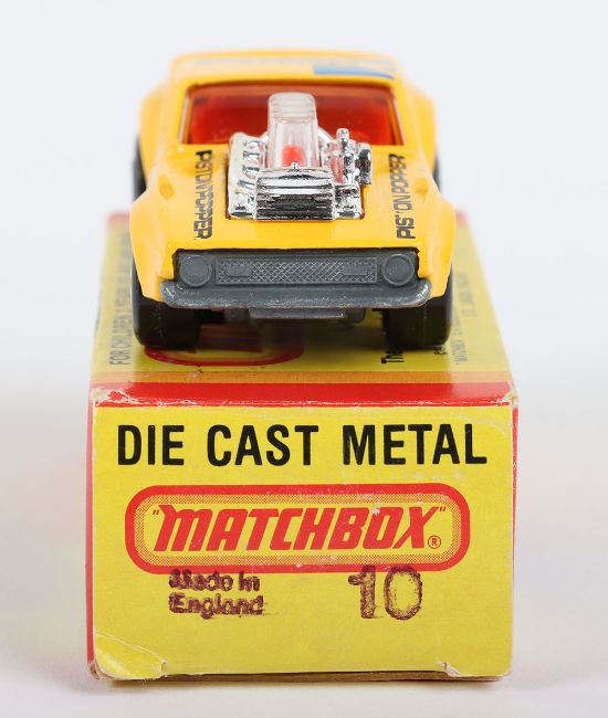 Matchbox Lesney Superfast Model, England: MB-10 Piston Popper with hard to find YELLOW body & MACH 1 PISTON POPPER 60 prints, DARK Amber glass, unpainted Made in England base as opposed to subsequent Hong Kong base, model has mint paintwork with some flaws to areas of prints mainly to roof where some is faint, therefore overall graded as near mint in a very near mint M box issued in 1982. This was a USA limited edition model with 1st issue Made in England base and also Made in England stamped on one end flap of box along with number 10 for the model (1 item)