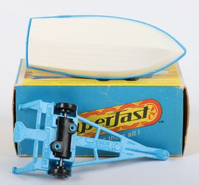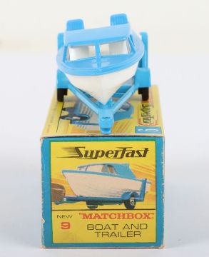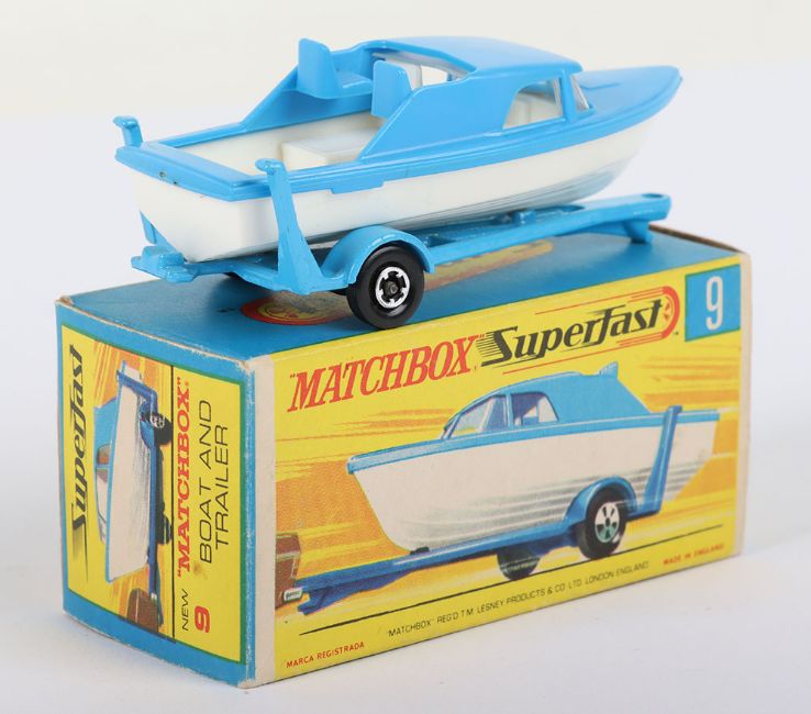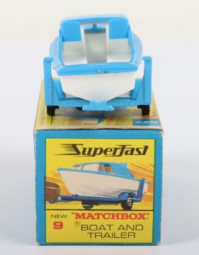 Matchbox Lesney Superfast Boxed Model, England: MB-9 Boat and Trailer, Transitional model with White body and Blue Deck,Light Blue Trailer with Thin Centre-Cut wheels, as opposed to dark blue trailer with thin 5-spoke wheels,model mint in near mint to mint G box with NEW to end flaps, slight creasing to bottom striker side (1 item)