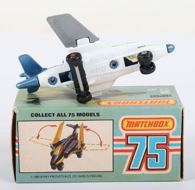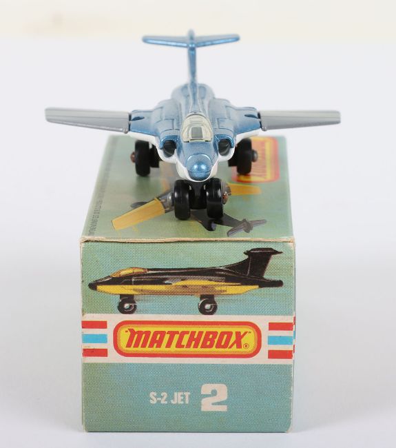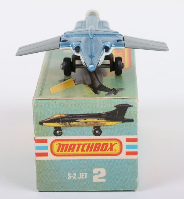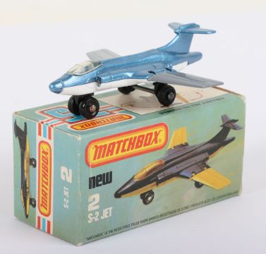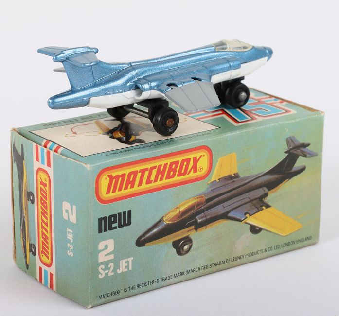 Matchbox Lesney Superfast Boxed Model, England: MB-2 S-2 Jet with rarer PLAIN GREY folding wings as opposed to usual White or Grey wings with VIPER prints, Metallic Blue body, White England base, Clear glass, model is mint in a near mint L box (1 item)