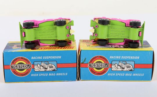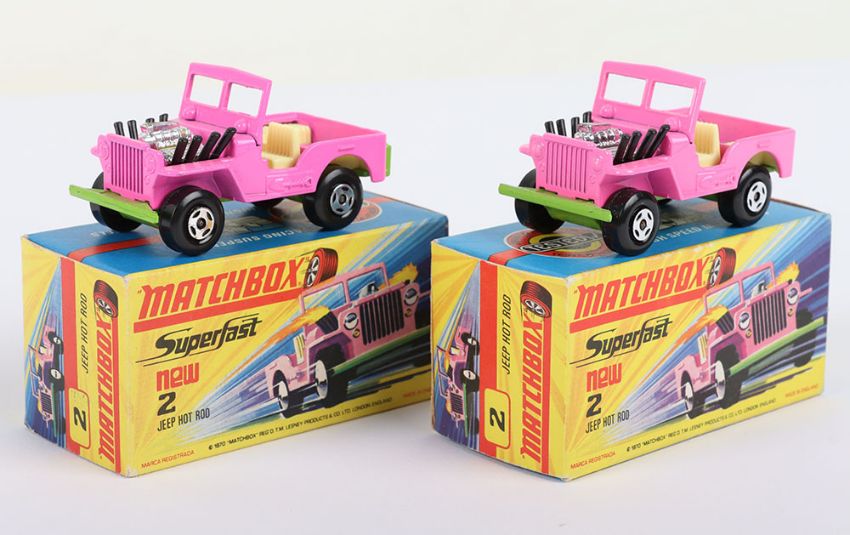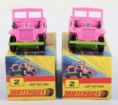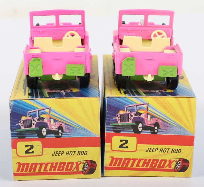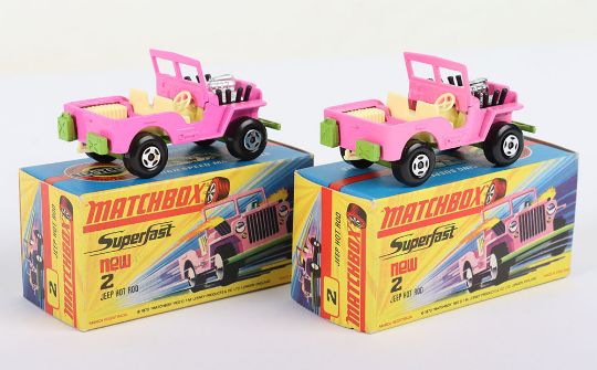 Two Matchbox Lesney Superfast Boxed Models, England: MB-2 Jeep Hot Rod, 2 model variations 1) LIGHT Pink body with Ivory seats & Tow Hook, Dark Green base and 2) DARK Pink body with Ivory seats & Tow Hook, Dark Green base, both models very near mint with 1 and 2 small marks to each vertical Gas Can in mint and near mint I boxes, slight mark to underside of near mint box (2 items)