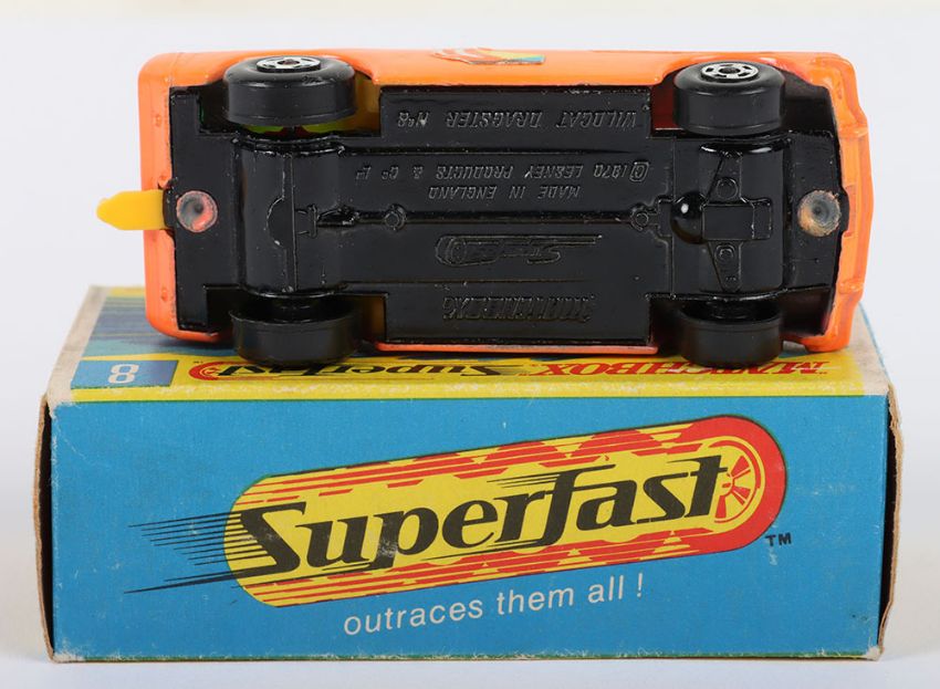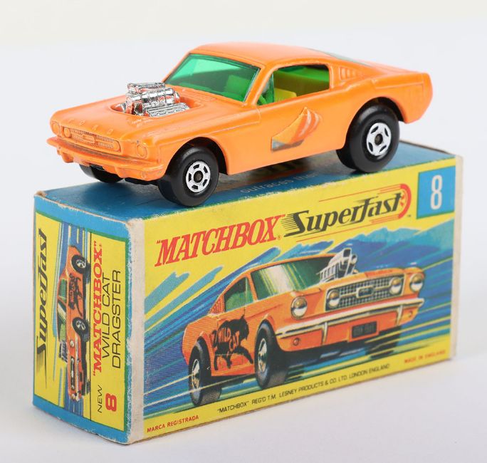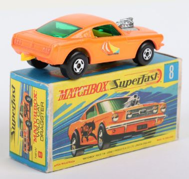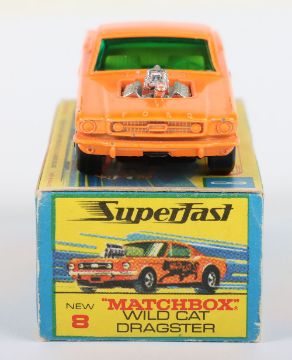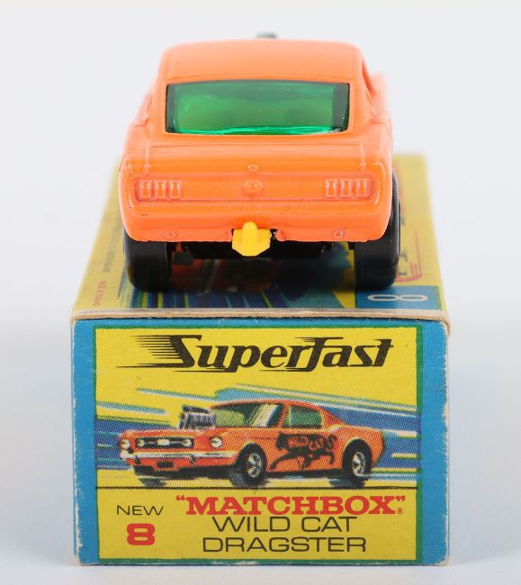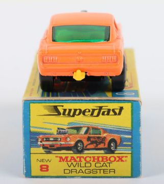 Matchbox Lesney Superfast Boxed Model, England: MB-8 Wild Cat Dragster, Orange body with scarce SAILBOAT labels, Gloss Black base, Wide 5-Spoke front and 4 -Spoke rear wheels, model near mint with glue bleed through to one label in excellent to near mint G box with NEW to end flaps (1 item)