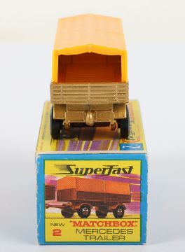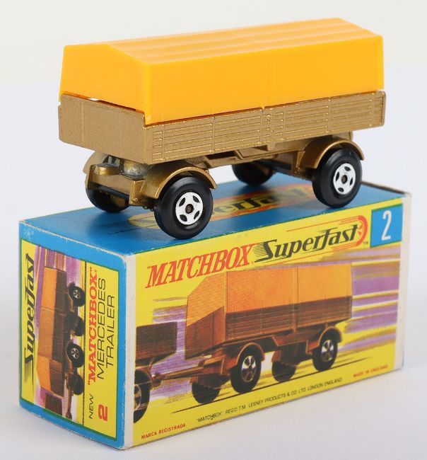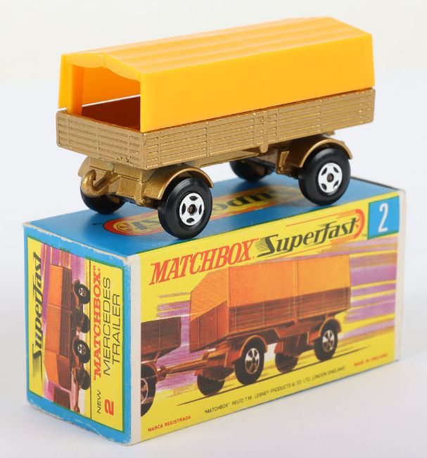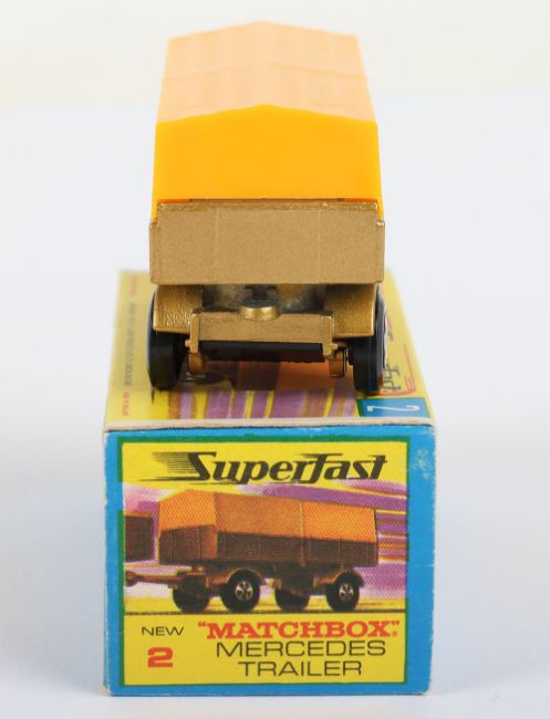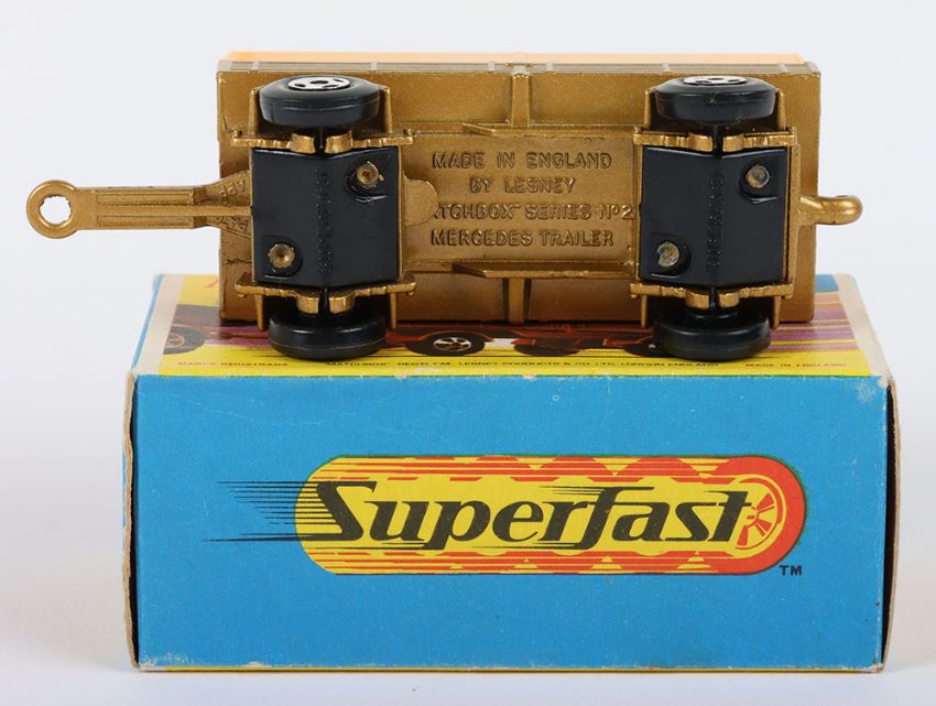 Matchbox Lesney Superfast Boxed Model, England: MB-2 Mercedes Trailer with THIN 4-Spoke wheels as opposed to 5-Spoke wheels, Transitional model with Gold body and Dark Yellow canopy, model has mint paintwork and very near mint to mint canopy with just a faint mark on one side when light catches it, otherwise mint in near mint G box with NEW to end flaps (1 item)
