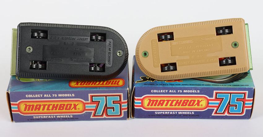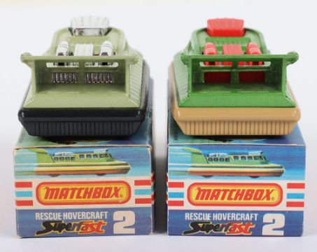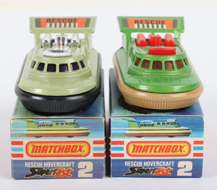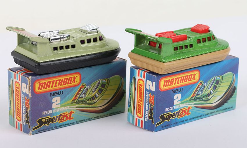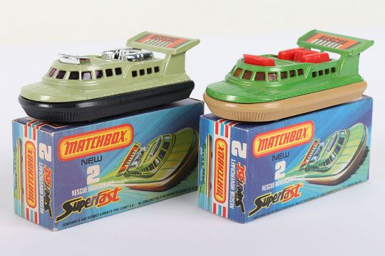 Two Matchbox Lesney Superfast Boxed Models, England: MB-2 Rescue Hovercraft with 2 rarer variations 1) Metallic Green body with RED AIR SCOOP & PIPES as opposed to usual Chrome, AMBER windows, Rescue label, Tan skirt and 2) AVOCADO body with Chrome air scoop & pipes, PURPLE windows, RESCUE label as opposed to usual 2000 label on this colour model, BLACK skirt, models are mint and near mint, small mark on front of Avocado body in a mint J box and a near mint J box with partial tear along hinge of one end flap, plus ink printing shade variations (2 items)