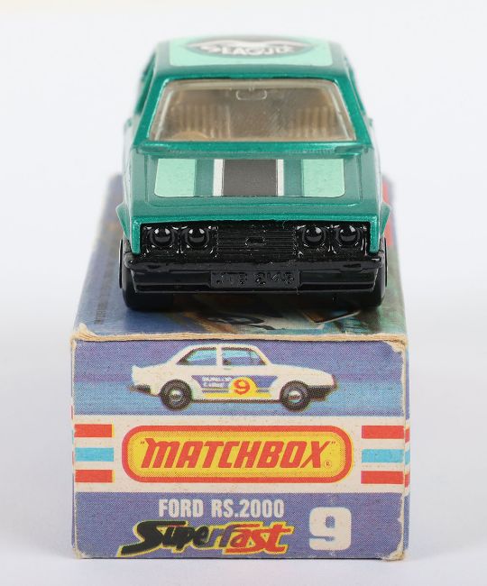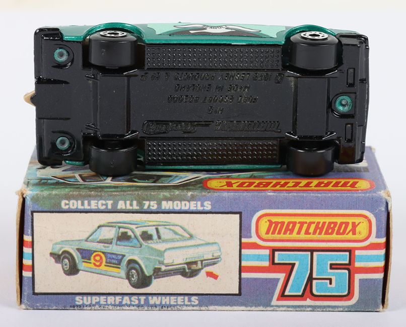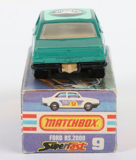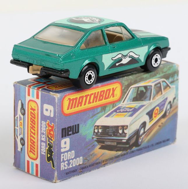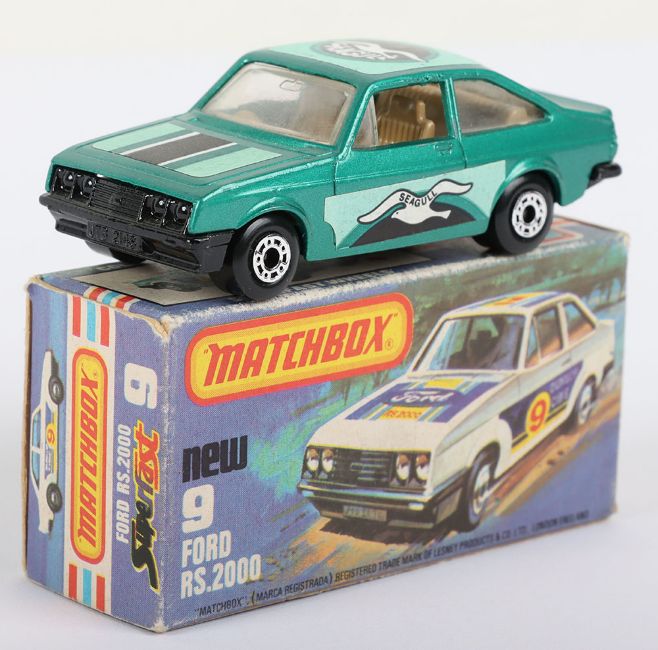 Matchbox Lesney Superfast Boxed Model, England: MB-9 Ford RS2000 Escort with GREEN body and Seagull labels, Seagull facing backward and can be found facing forward, Black base, model is mint with very minor glue bleed through to roof & hood labels in near mint L box (1 item)