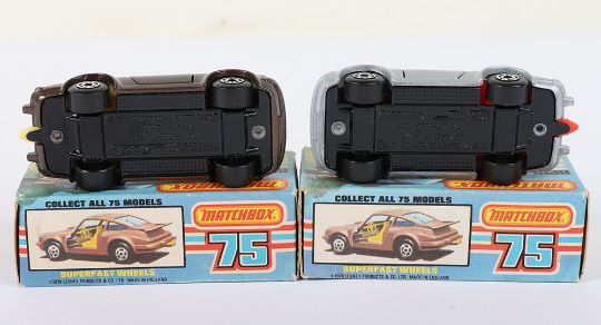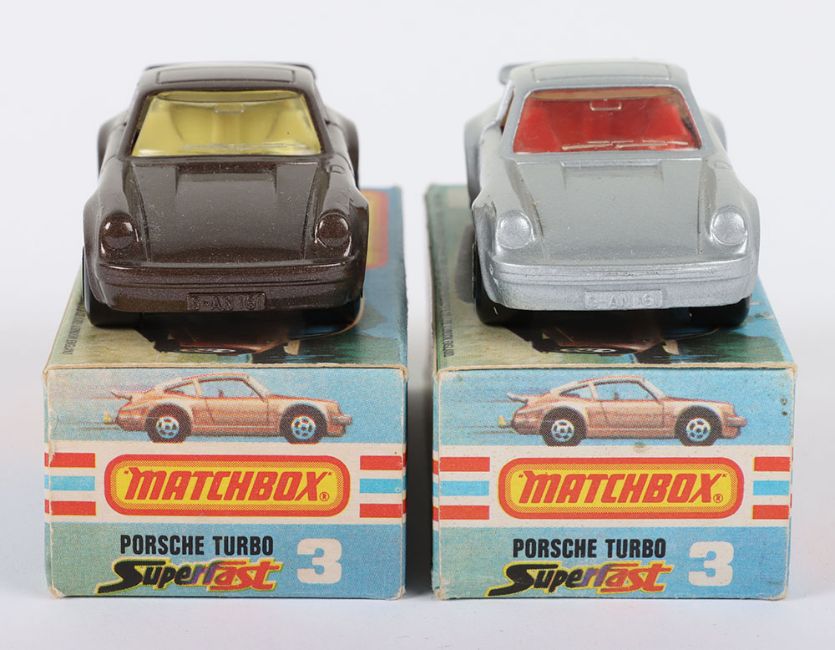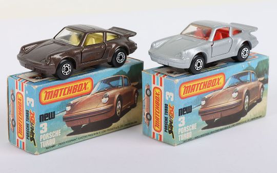 Two Matchbox Lesney Superfast Boxed Models, England: MB-3 Porsche Turbo, 2 model variations 1) Metallic Brown body with Yellow interior & Tow Hook, Opening doors, Black base and 2) Silver body with Red interior & Tow Hook, Opening doors, Black base, models are mint and very near mint in near mint L boxes with NEW to faces and with 2 lines of text to one striker side (2 items)
