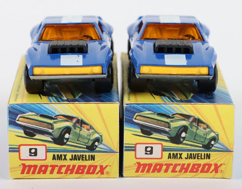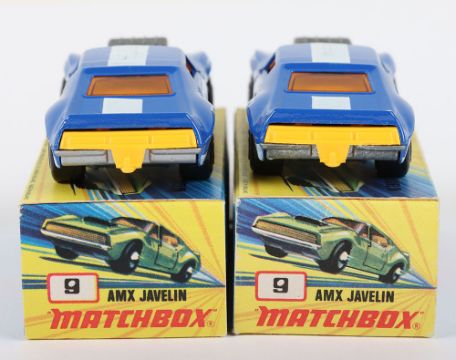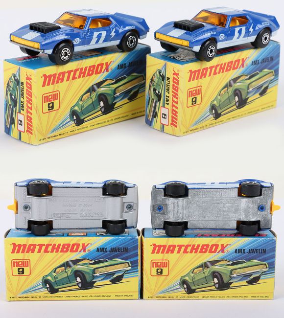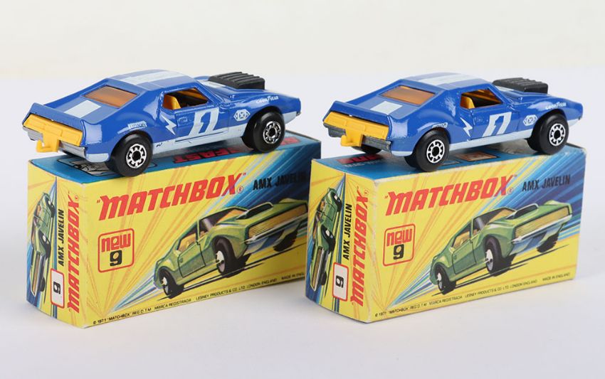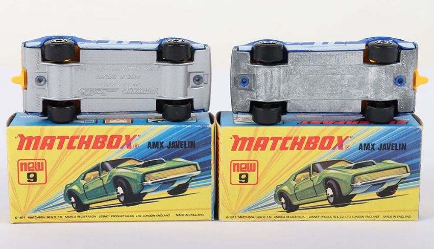 Two Matchbox Lesney Superfast Boxed Models, England: MB-9 AMX Javelin, 2 model variations both with DARK Blue body & prints 1) with Unpainted base and 2) with rarer SILVER painted base, both models mint with usual print anomalies in mint I boxes (2 items)