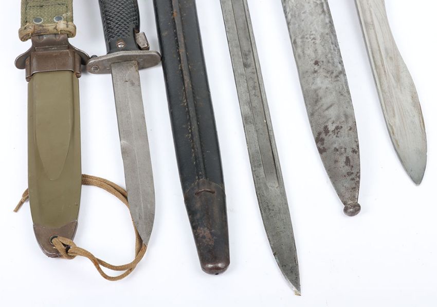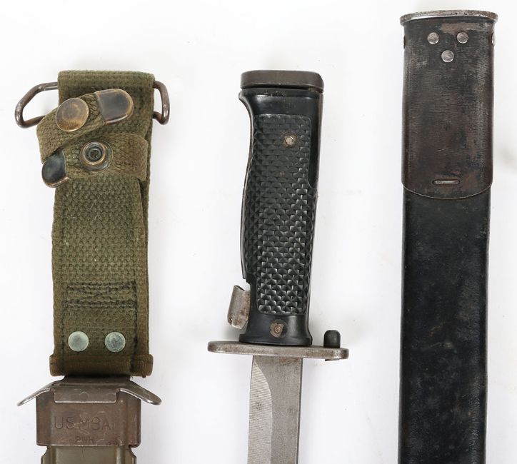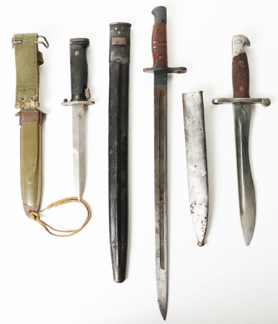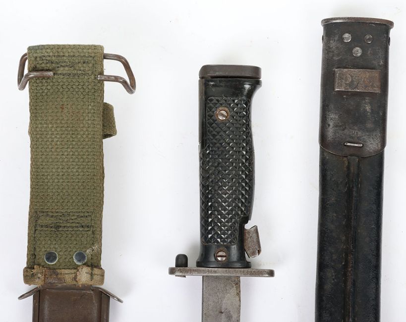 Three Bayonets: WW1 US M17 bayonet made by Remington complete with scabbard, Spanish Bolo complete with scabbard and US M5 bayonet with scabbard. 3 items