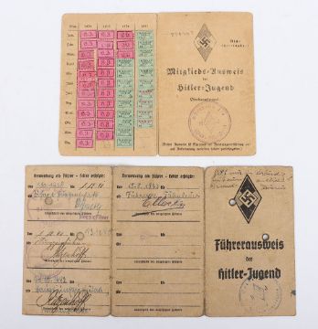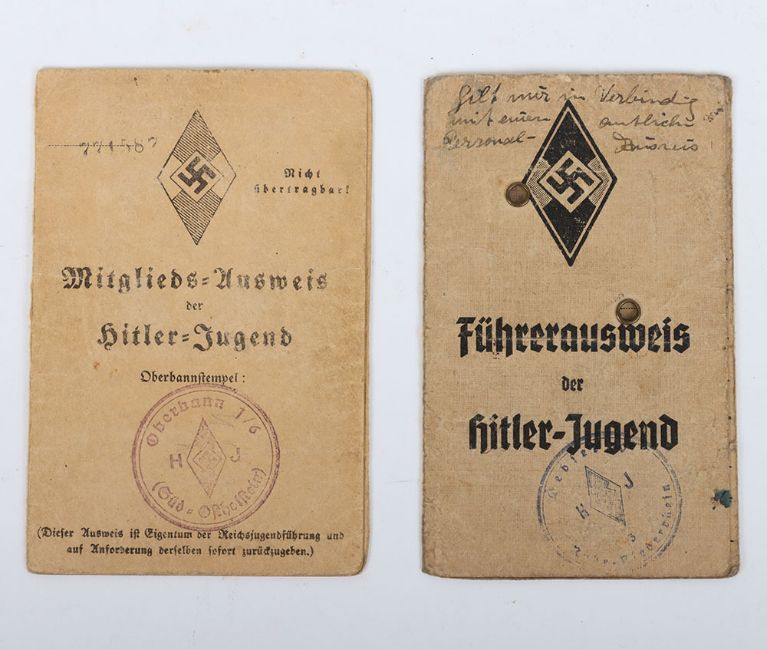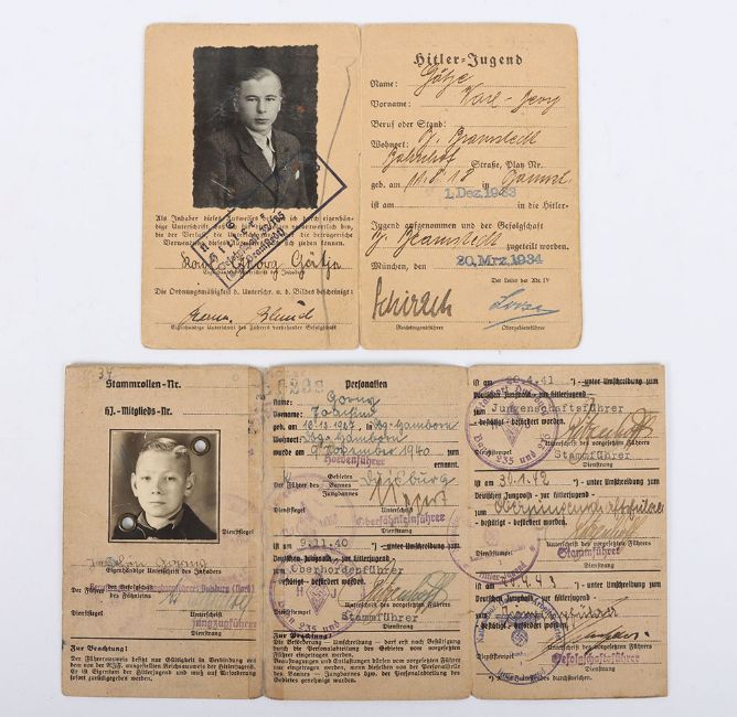 Third Reich German Hitler Youth HJ ID Cards: Two cards one uniform other with civil photograph and details with clear HJ franking and one with donation stamps to back. 2 items