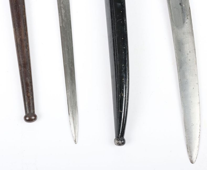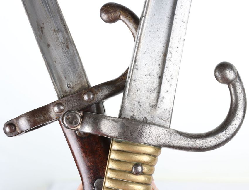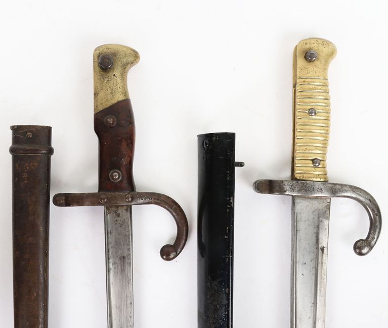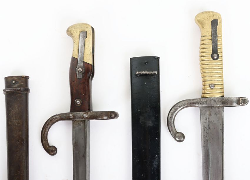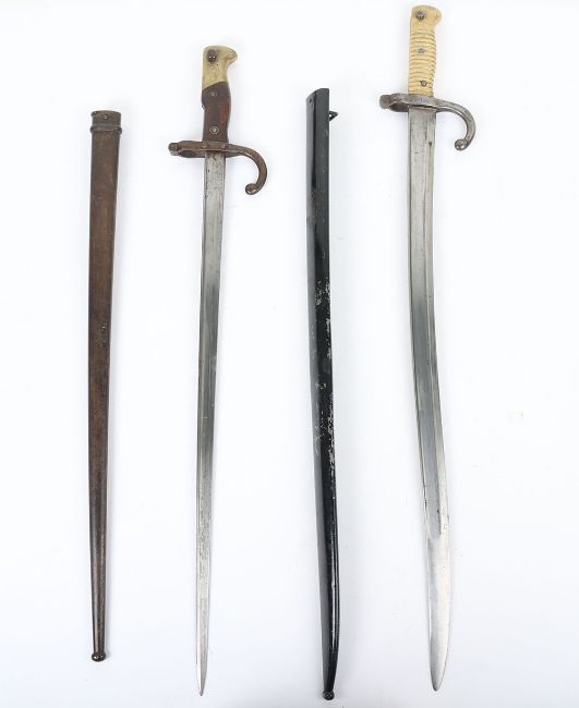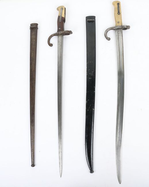 French Bayonets: Gras M1874 bayonet complete with metal scabbard, dated 1876 to top of blade, with Chassepot bayonet complete with scabbard dated 1870 to top of blade. 2 items