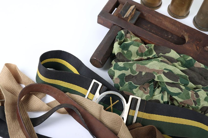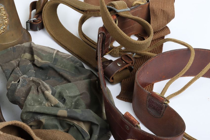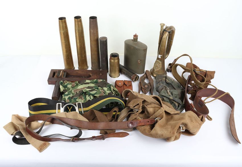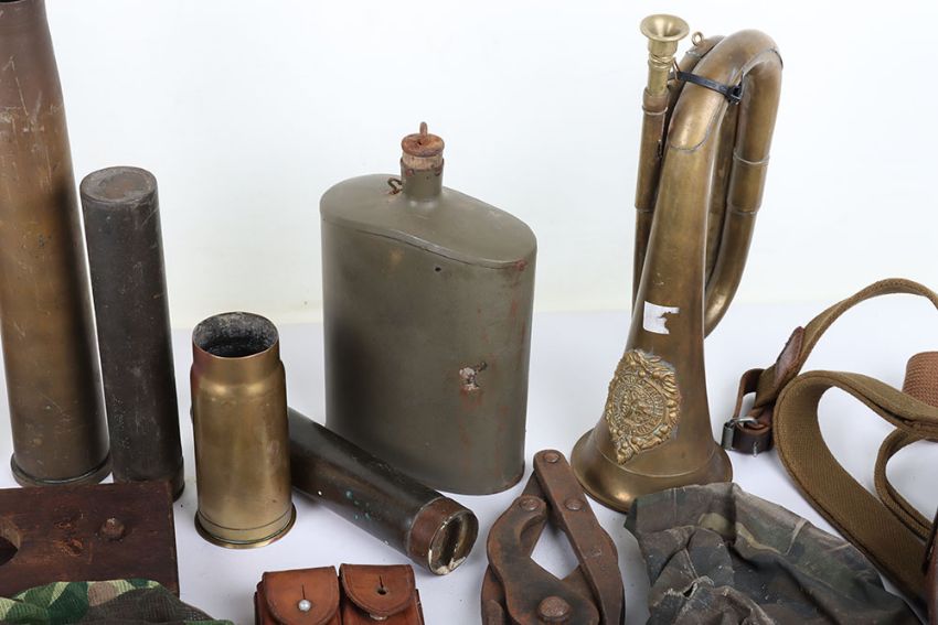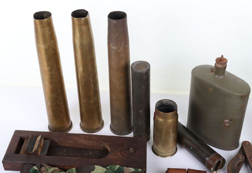 Military Shell Cases and Equipment: Three 40 mm shell cases, French 1894 shell case, water canteen, Sam Brown belt with cross strap, wooden gas rattle, lanyard, ties ,wire cutters and more. Quantity