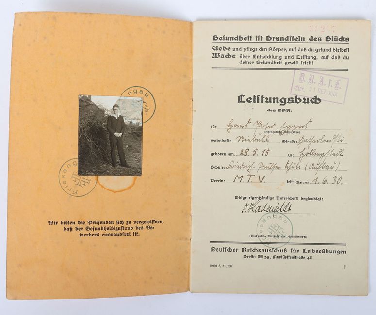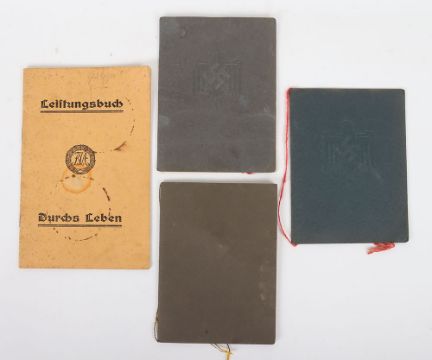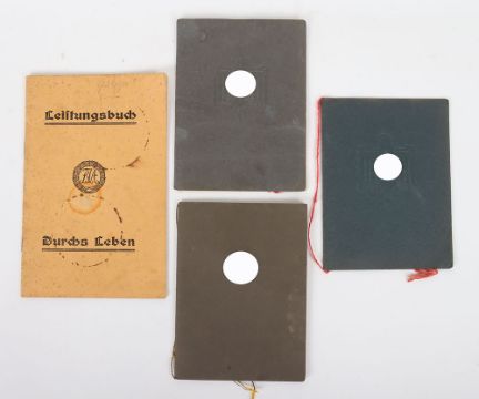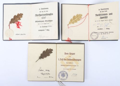 German Third Reich Sports Books: Three NSRL citation booklets with bronze and gold oak leaves and early sports book with details and owners photograph. 4 items
