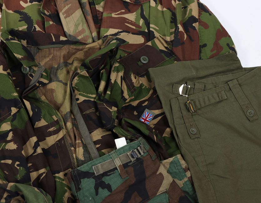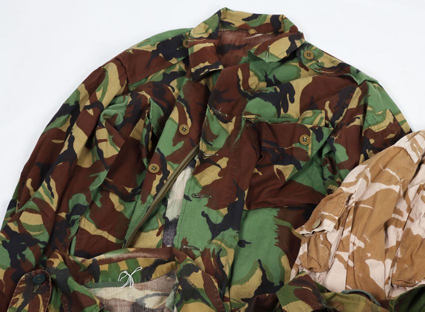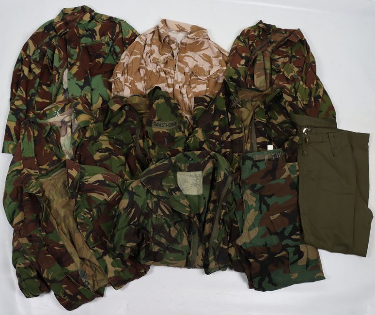Military Camouflage and Combat Clothing: British green light weight combat trousers and mixed British, NATO and US combat camouflage trousers , shirts and smocks. 10 items