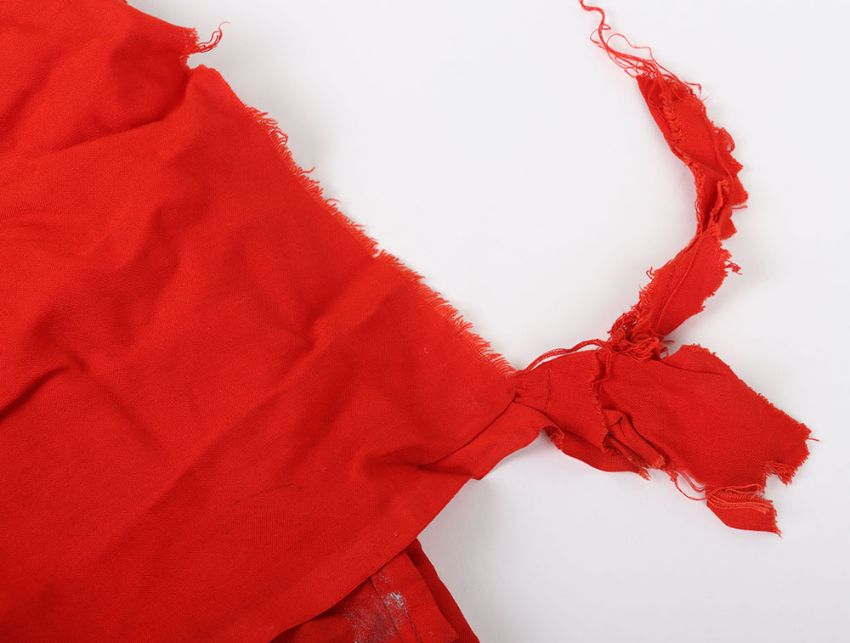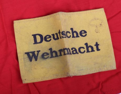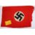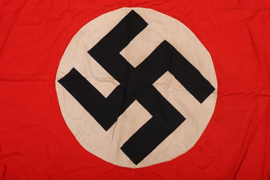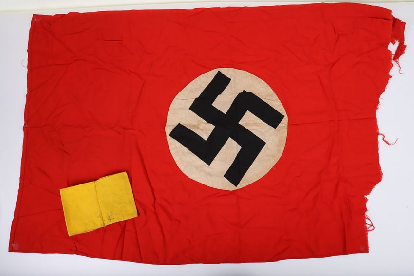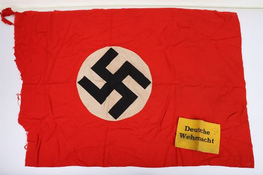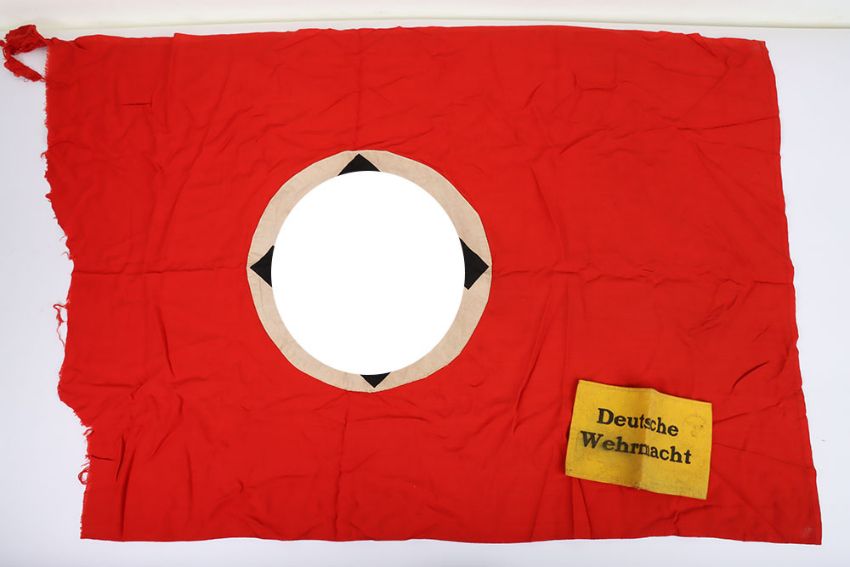 WW2 German NSDAP Party Flag and Armband: Printed DEUTSCHE WEHRMACHT armband with faint stamping and two piece construction flag with swastika on white stitch to red on both sides, torn to top, size 101 x 68 cm. 2 items
