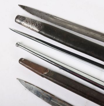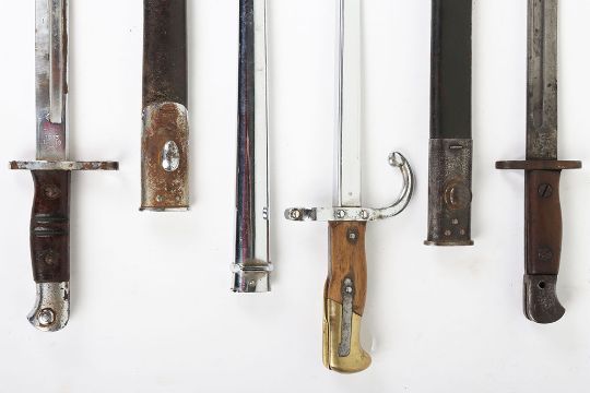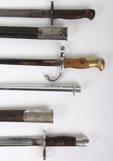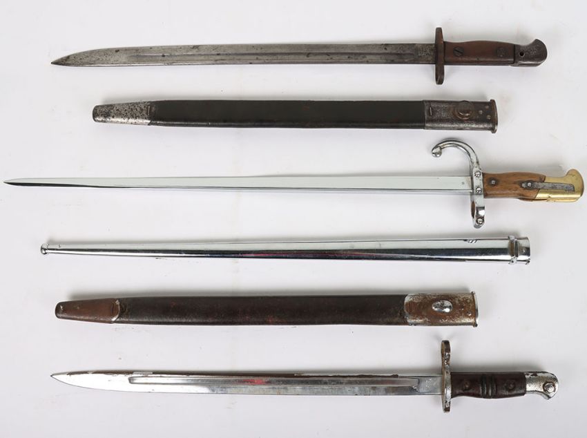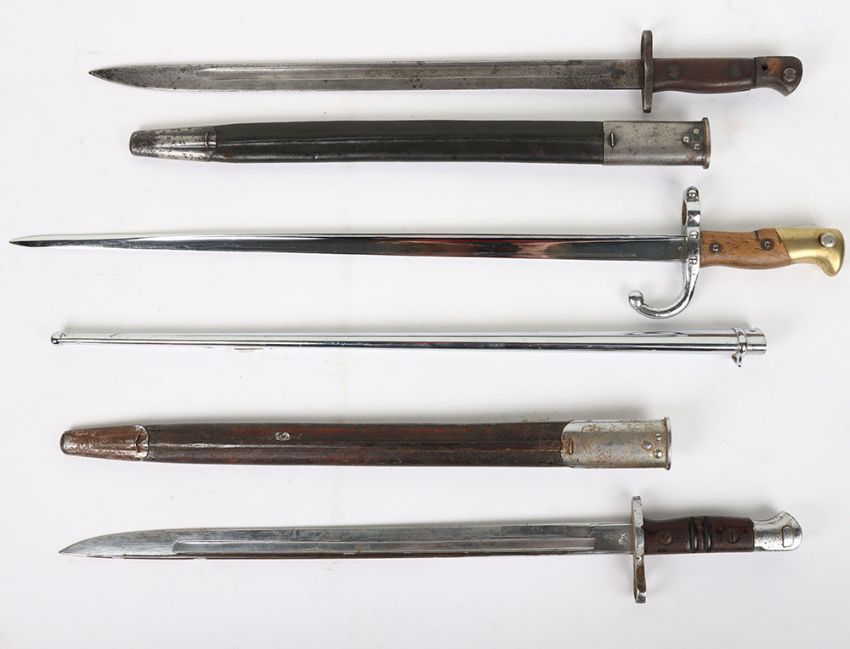 Three Bayonets: Parade finish chrome French Gras bayonet complete scabbard, 1907 bayonet complete with scabbard and WW1 US 1916 REMINGTON made parade finish bayonet and scabbard. 3 items