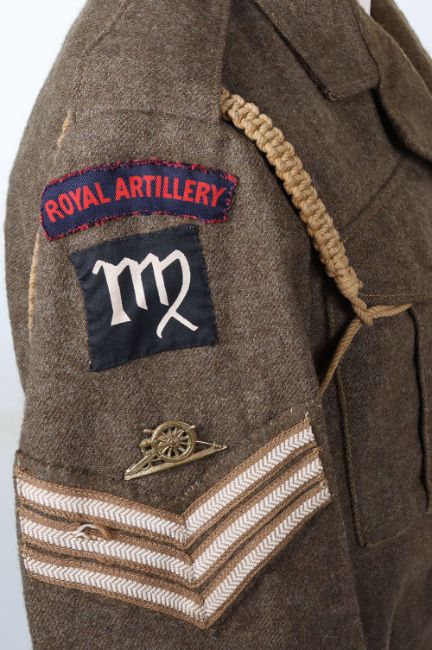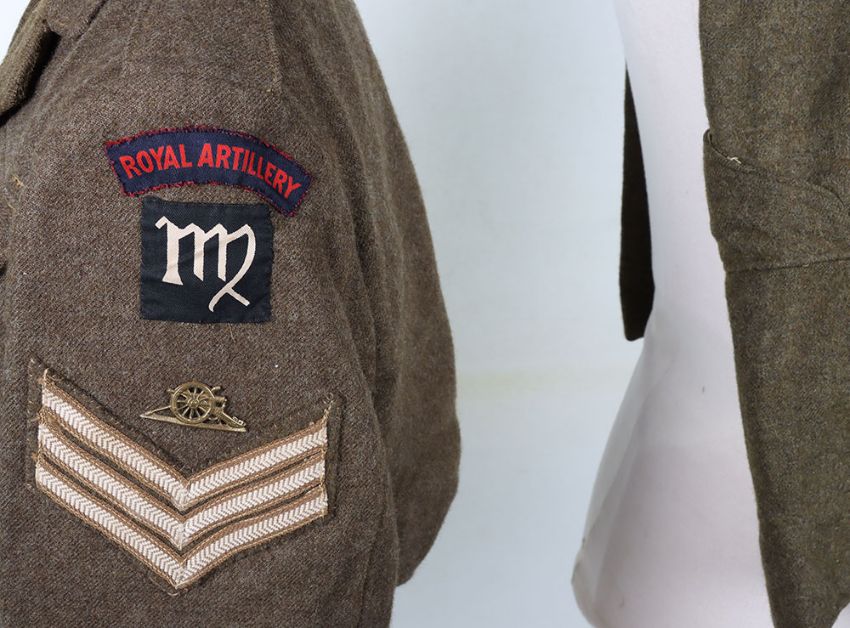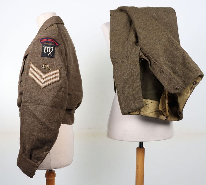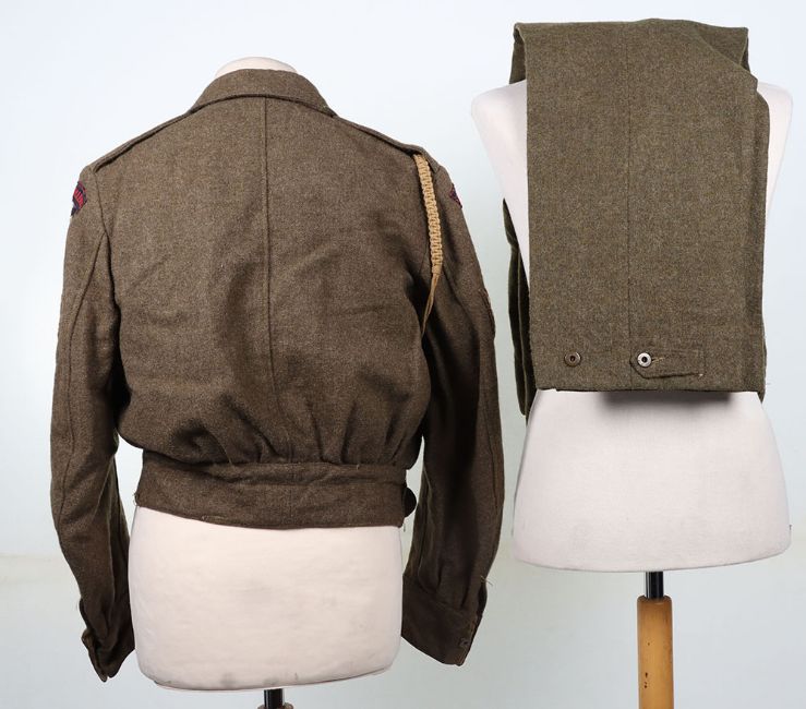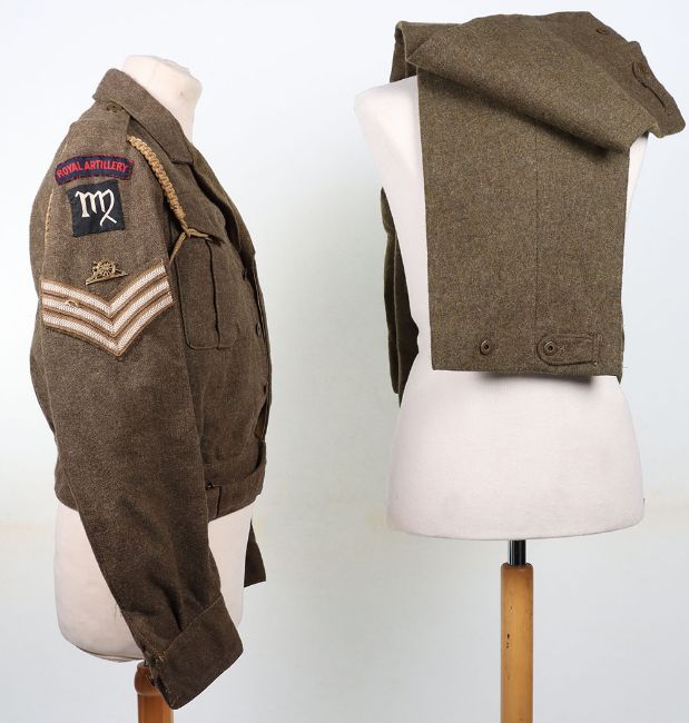WW2 RA Battle Dress Blouse and Trousers : Canadian made BD blouse with printed Royal Artillery titles and 6 AGRA formation badges, brass RA badge with stripes and lanyard, label inside 1943 , later tailored collar with Canadian made 1945 label Battle Dress trousers. 2 items