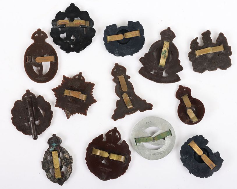 WW2 British Plastic War Economy Badges: Mostly cap badges to include ATS, RAF,RE, RASC, ATC,REME and others to include a pair of RM collars. 13 items