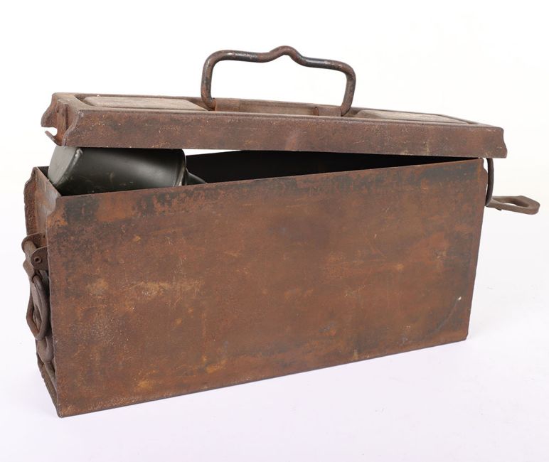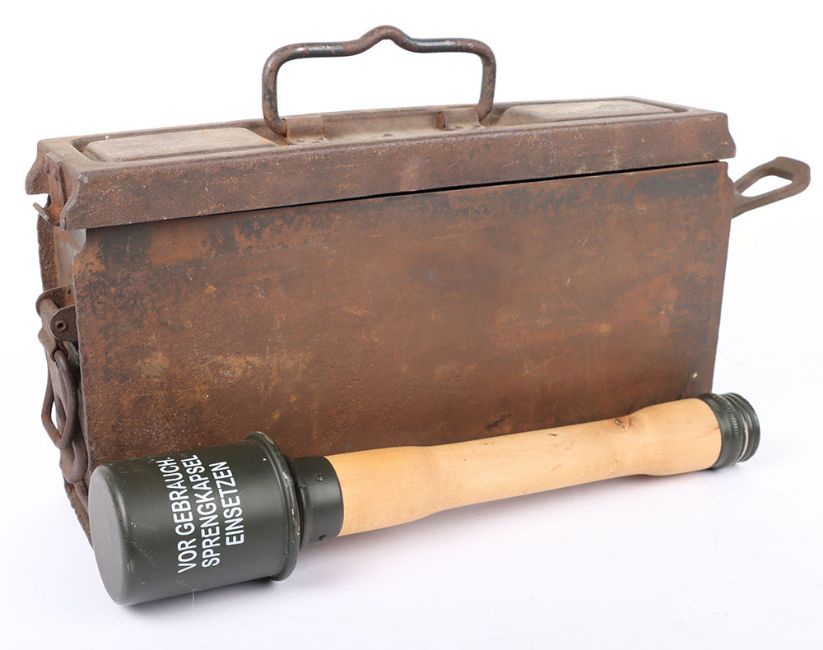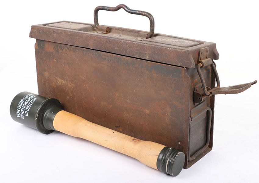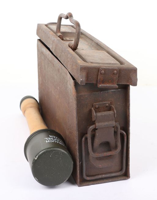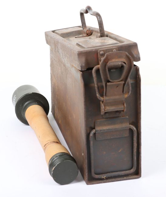 WW2 German MG 34/42 Ammo Tin: Steel tin with stamping to top brc 43 with clasps and wooden copy stick grenade. 2 items