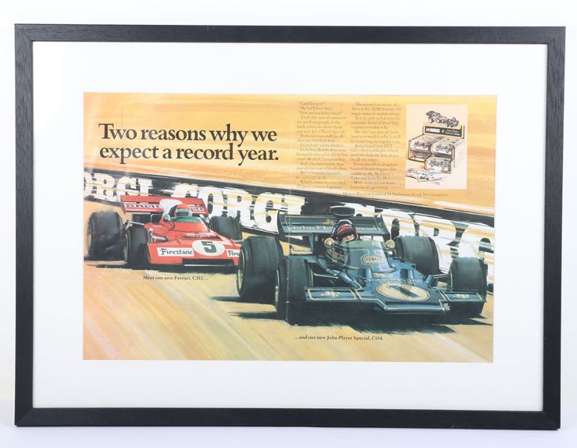 Corgi Toys John Player Special original shop poster, ‘Two reasons why we expect a record year meet our new Ferrari C152 and our new John Player Special C154 Formula 1 Racing Cars’ circa 1973,with picture of Corgi Toys Shop Counter Pack of twelve 154 John Player Lotus Formula 1 Racing cars, in very good original condition, one fold, glazed & framed 62cms x 45.5cms.