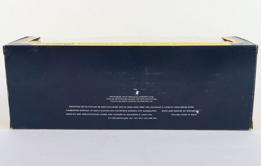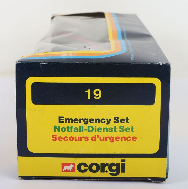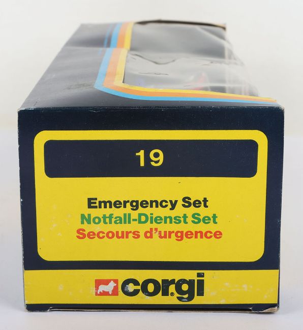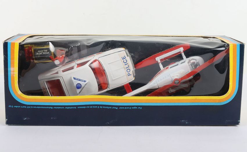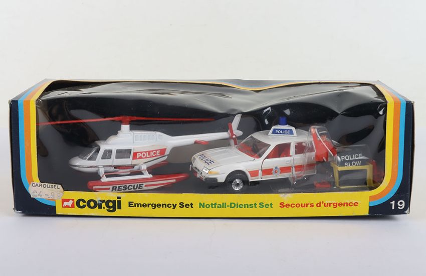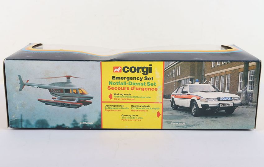 Corgi Emergency Set 19, C339 Rover 3500 Police Car, white/red body, detailed chrome wheel hubs and C921 Hughes OH-6A Helicopter, red/white body, plus police man figure, signs, bollards still sealed in bubble, in mint original boxed condition, vintage price label.