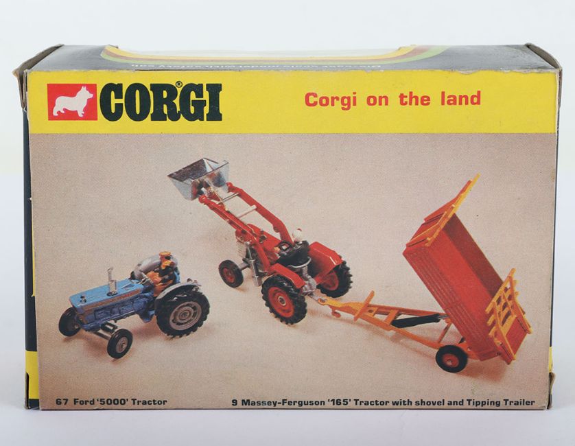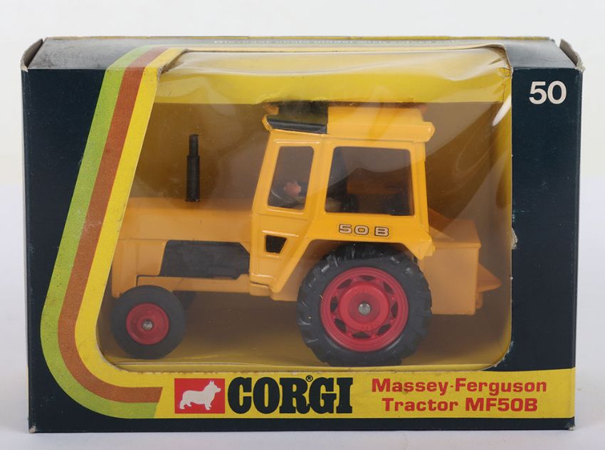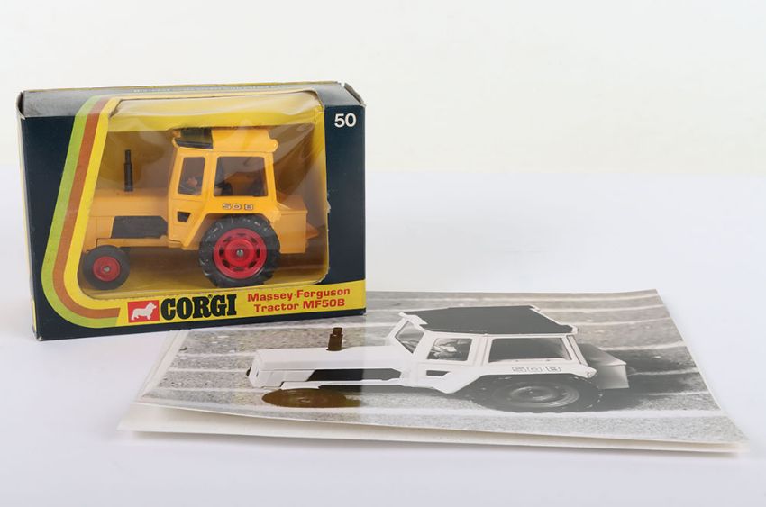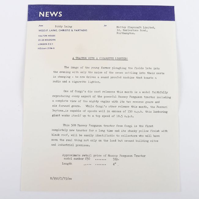 Corgi 50 Massey Ferguson Tractor MF50B yellow/black body, red plastic wheel hubs, in mint boxed original condition, with scarce Woolf, Laing, Christie & Partners News Letter for Mettoy Playcraft Limited ‘A Tractor with a Cigarette Lighter, dated 7/73 with black & white publicity photograph . (2 items)