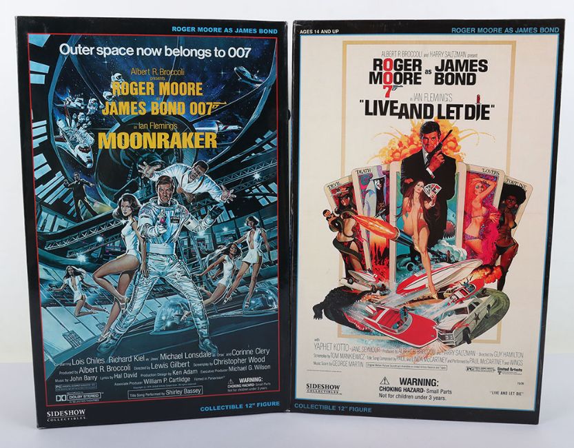 Two James Bond Sideshow Roger Moore 12 inch Action Figures Dolls Boxed. Including Moonraker Roger Moore as James Bond opened new in box minor box wear. Live and Let Die Roger Moore opened new in box minor box wear. (2 items)