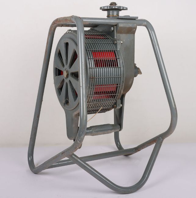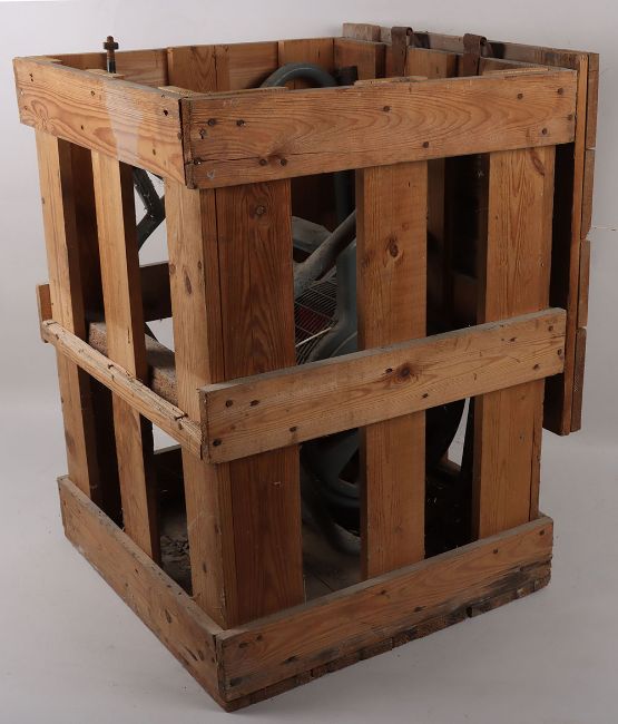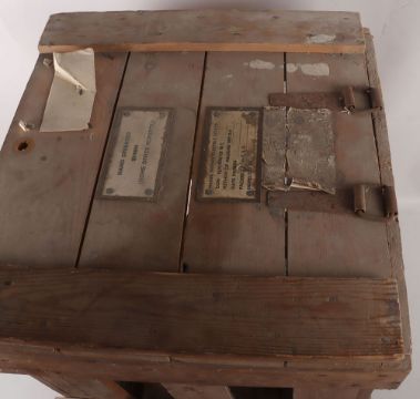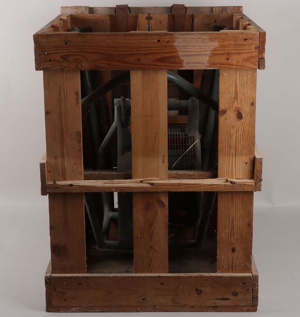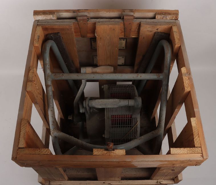 British Air Raid Siren in Box: Cold War period hand operated air raid siren, circa 1962, painted in traditional RAF grey, retaining original pine wood packing crate with labels attached for 'Hand Operated Syren[sic] (Home Office Property.), and makers trade label for 'Service Electric Co. Ltd', dated May 1962, the crate 62cm high x 45cm wide x 43cm deep, with original instructions for use. Not suitable for in house shipping, specialist shipping or collection only