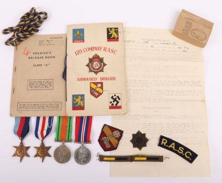 WW2 Medals and Ephemera group B.O, DOWD Driver R.A.S.C: Medals with ribbons War, Defence, France/Germany and 1939-45 stars with cloth badges , plastic cap badge and lots of paperwork. Soldiers service and release books, Second Army thanksgiving service booklet, 170 company booklet and related documents.
