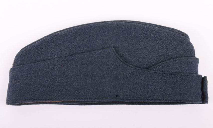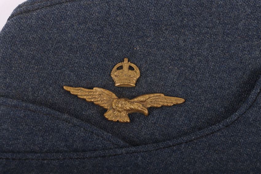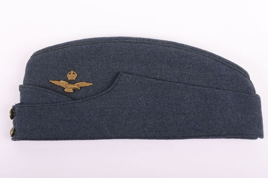 WW2 RAF Officers Side Hat: Officers two piece badge to side and quality made hat with arrow stamp and dated 1943 with issue stamps, brass buttons to front.
