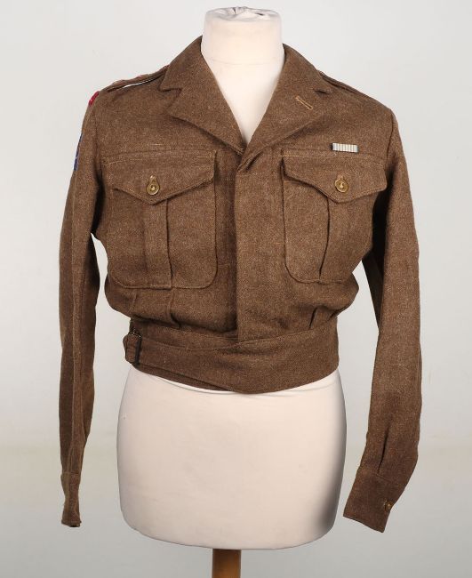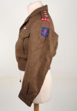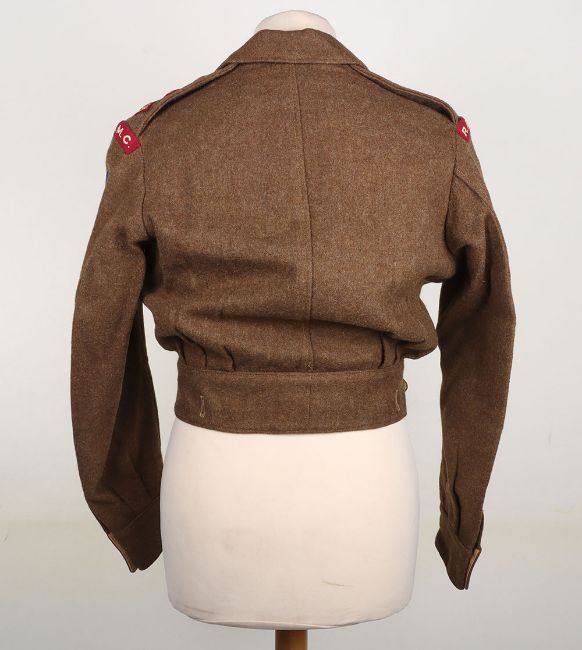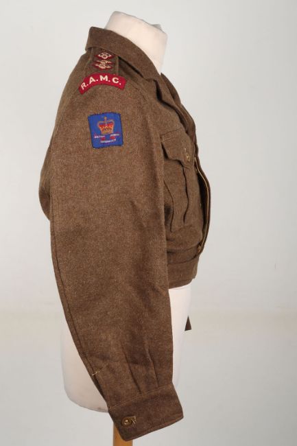 RAMC Battle Dress Blouse, British Commonwealth Forces, RAMC captains battle dress blouse, with embroidered RAMC titles, RAMC maroon pips and silk British Commonwealth Forces formation patches (QC). The United Nations Service Medal is pinned to the chest, for service in Korea or Japan. 1950 dated, size 8. Good clean condition.