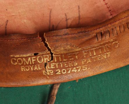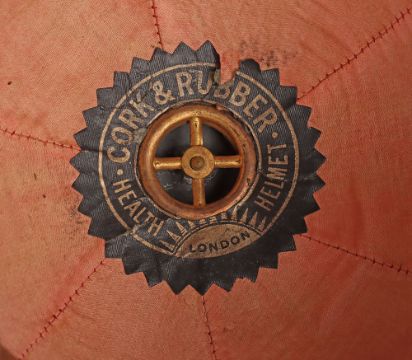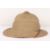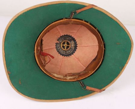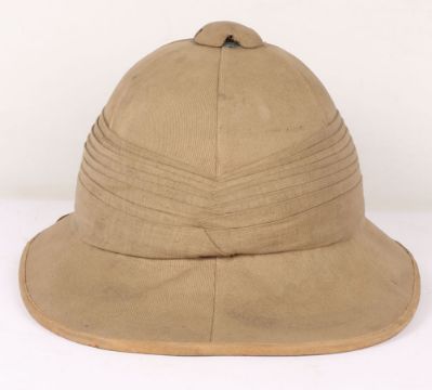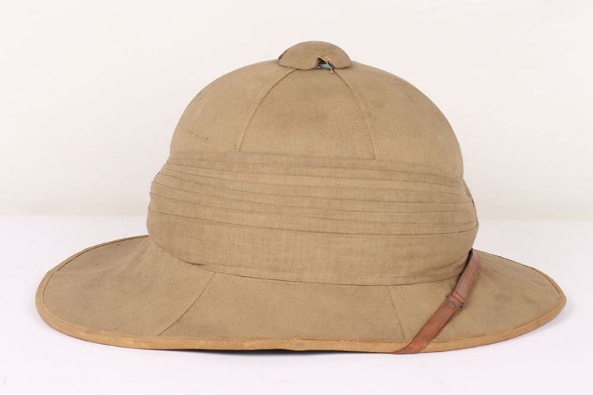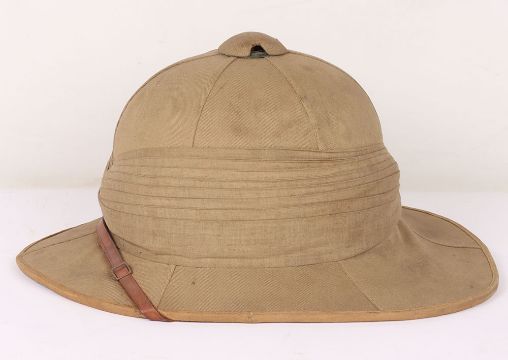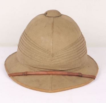 British Army Wolseley Pith Helmet: Vintage London made cork sun helmet complete with brown leather chin strap , some damage to leather sweet band and green cloth to inside.