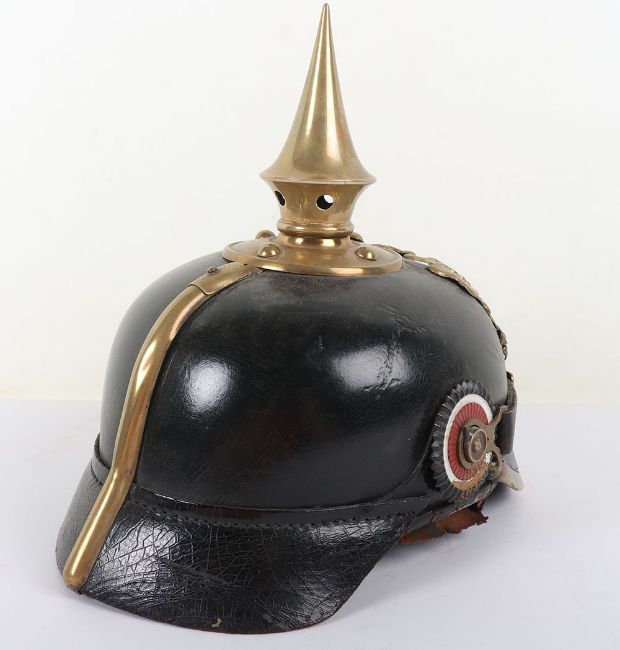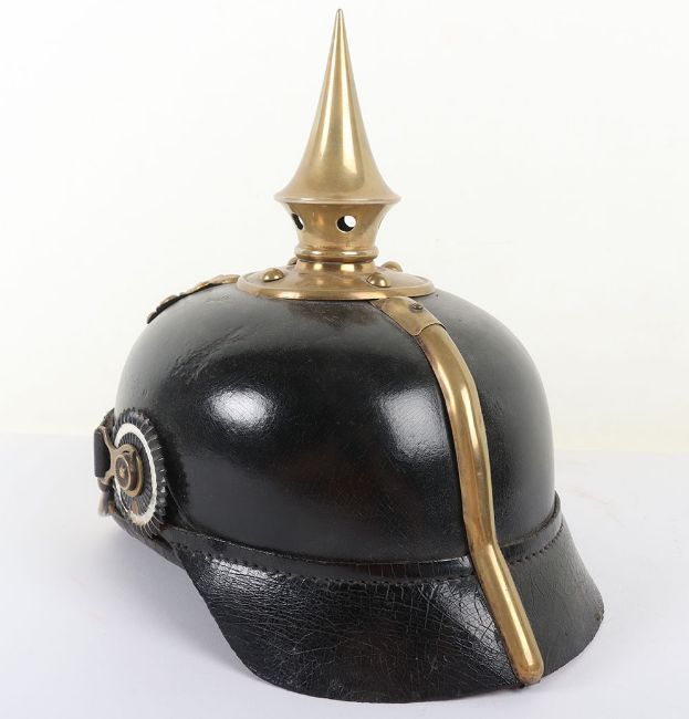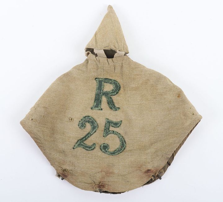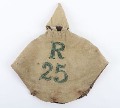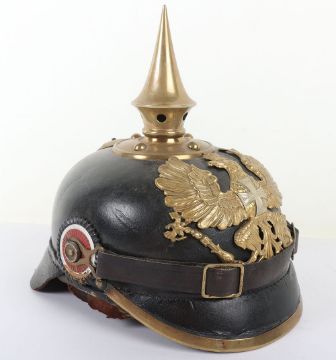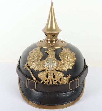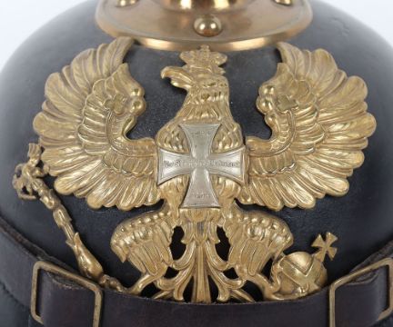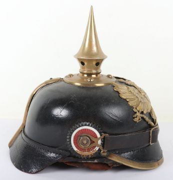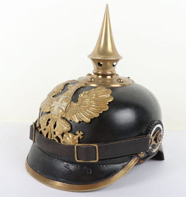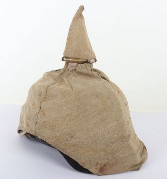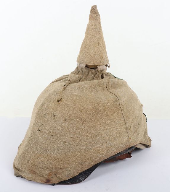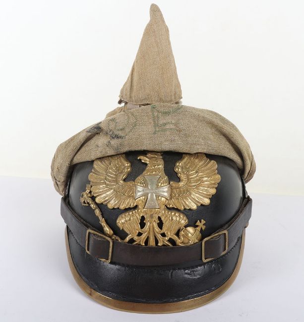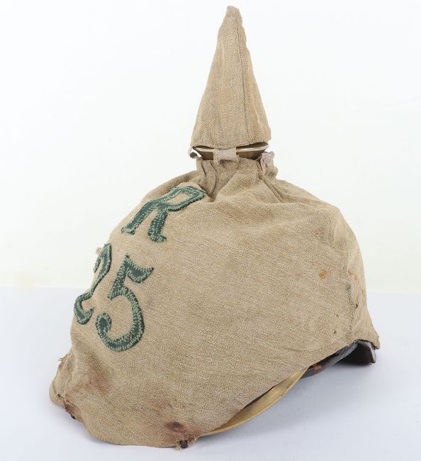 Imperial German Reserve Infantry Regiment Nr25 (1st Rhenish) “Von Lutzow” Pickelhaube Ensemble, consisting of an original fibre body other ranks pickelhaubes with Prussian reserve pattern helmet plate with cross inlaid to the centre of eagle chest and no mottos. Replaced state and reichs pattern cockades with leather chinstrap. Brass front trim, rear spine, circular spike base with tall pattern spike. Interior with leather liner system. Remains of a ink stamp to the rear peak. The helmet is accompanied by an original trench cover with green felt “R 25” to the centre. Helmet cover has three hooks to the front and two hooks to the rear section. Cover shows some service wear with some small stains and holes. Please note, C&T Auctioneers sold the helmet cover in 2022, so the helmet has been added to the ensemble.