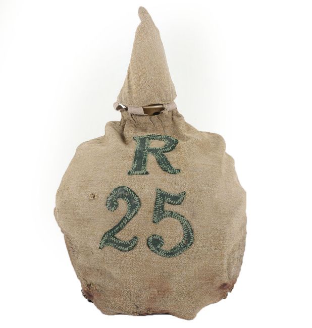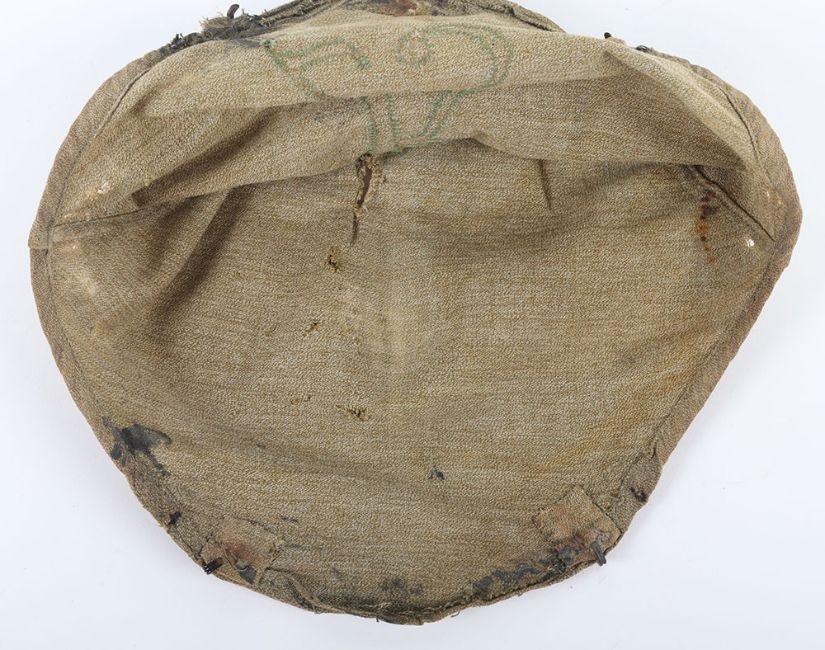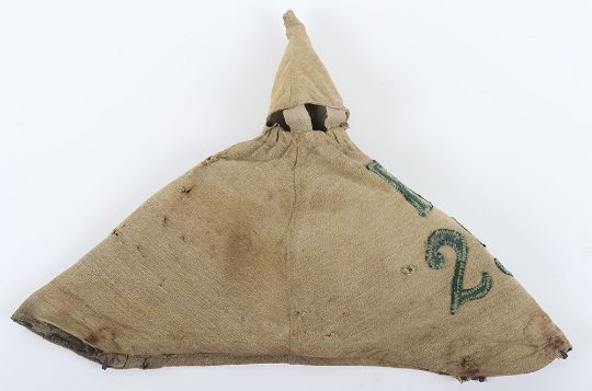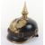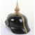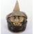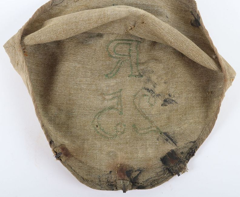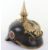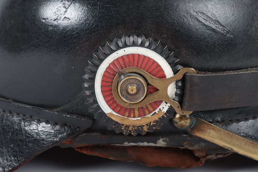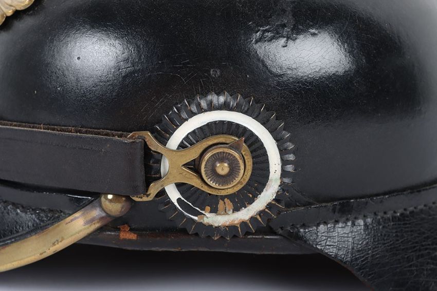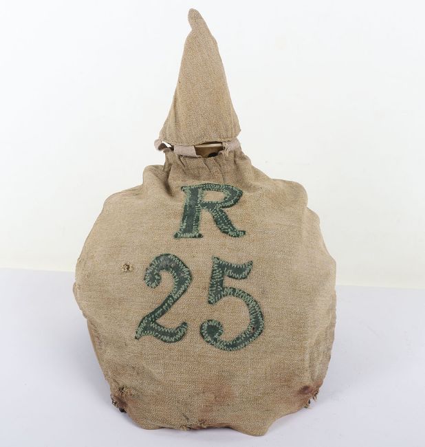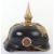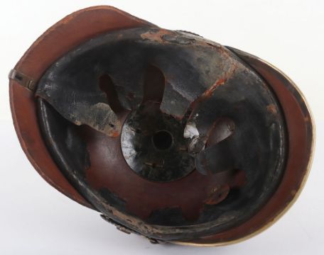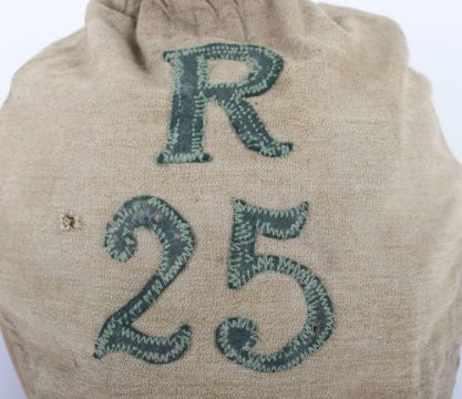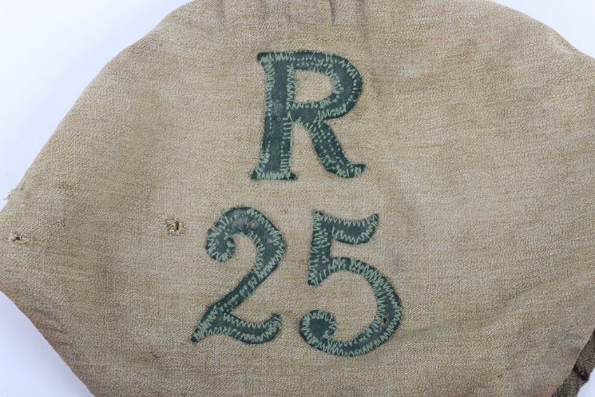 Imperial German Reserve Infantry Regiment Nr25 (1st Rhenish) “Von Lutzow” Pickelhaube Ensemble, consisting of an original fibre body other ranks pickelhaubes with Prussian reserve pattern helmet plate with cross inlaid to the centre of eagle chest and no mottos. Replaced state and reichs pattern cockades with leather chinstrap. Brass front trim, rear spine, circular spike base with tall pattern spike. Interior with leather liner system. Remains of a ink stamp to the rear peak. The helmet is accompanied by an original trench cover with green felt “R 25” to the centre. Helmet cover has three hooks to the front and two hooks to the rear section. Cover shows some service wear with some small stains and holes. Please note, C&T Auctioneers sold the helmet cover in 2022, so the helmet has been added to the ensemble.
